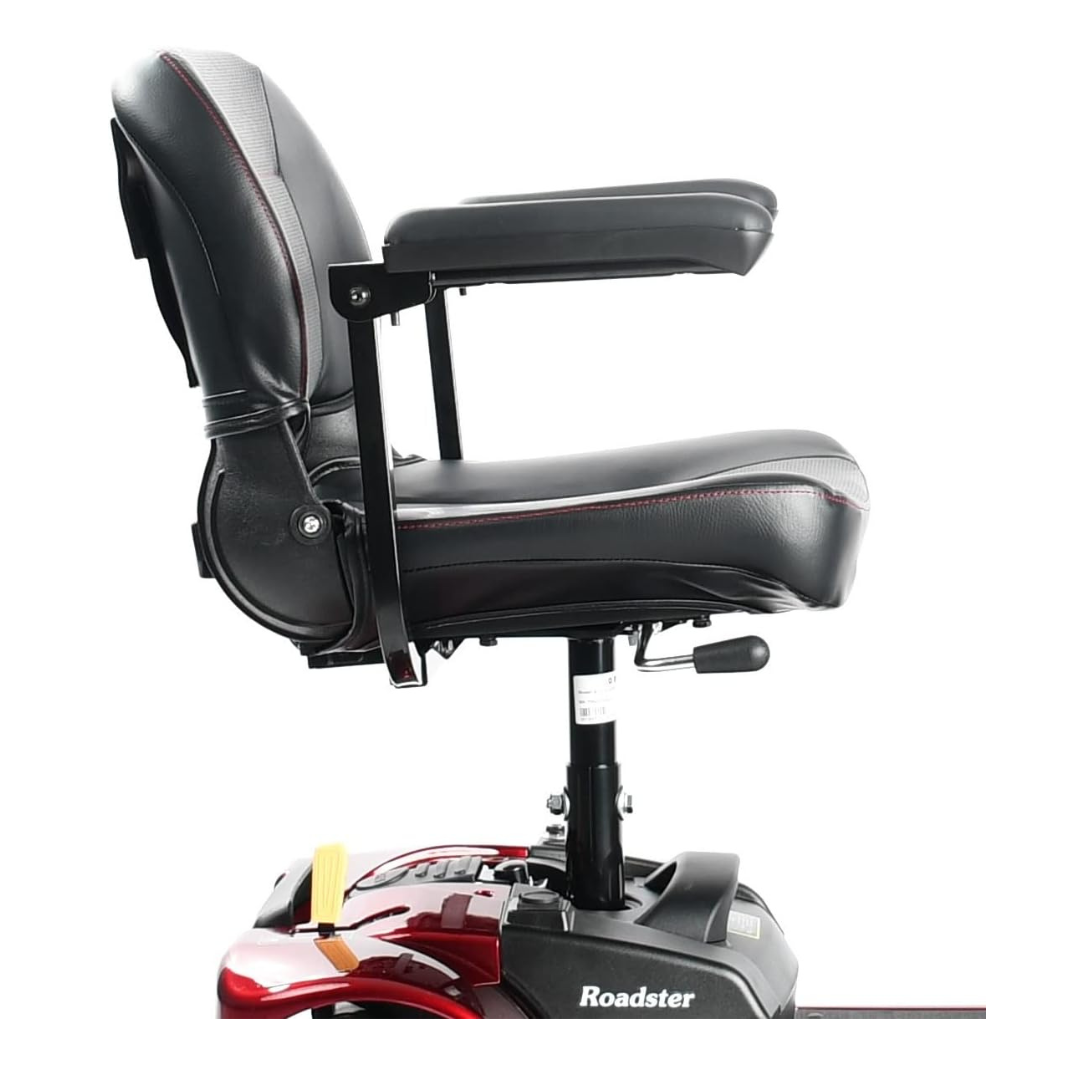The Merits Health Roadster 4 Wheel Mobility Scooter features 8 Foam Filled Tires and Includes 12 Ah Batts. 4Wheel Roadster has a simple compact design. Quickly dismantles without tools for easy transport and storage. Nonmarking puncture proof tires. Adjustable height seat. Flipup and width adjustable armrests. Adjustable angle tillerSpecifications. Color Red. Weight Capacity 300 lbs. Size 18 x 16 x 15