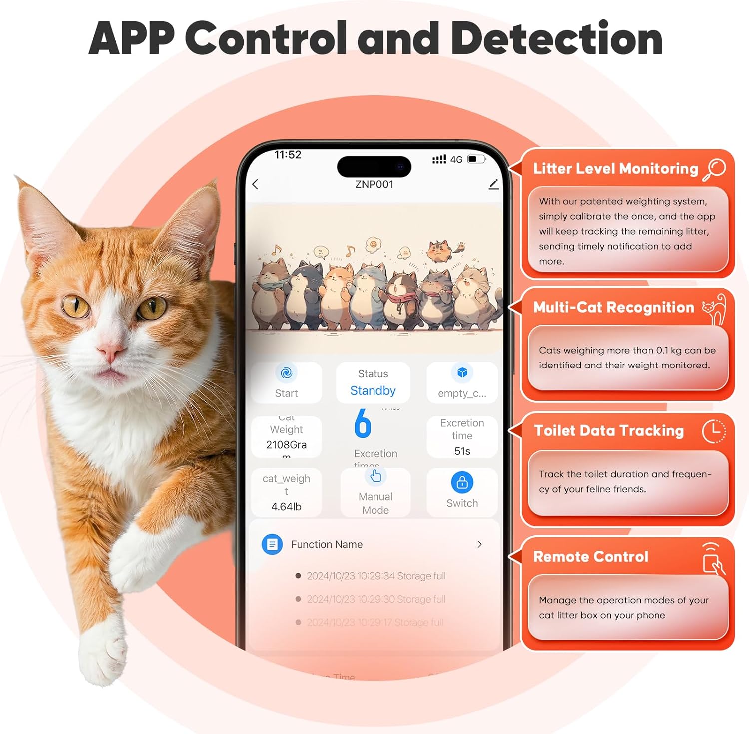 - 【Smart Anti-Clamp and Abnormal Alert System】: Self cleaning cat litter box equipped with infrared sensors and motion radar, the system prevents cats from being clamped during use. If abnormal movement is detected, the system stops, ensuring security. The app sends immediate alerts if there is an issue with the litter box.
