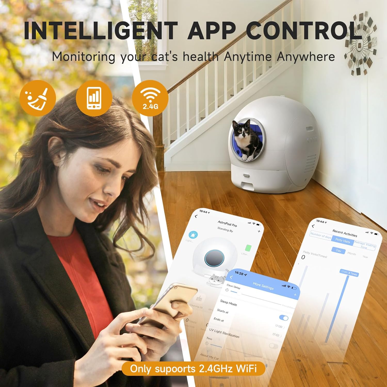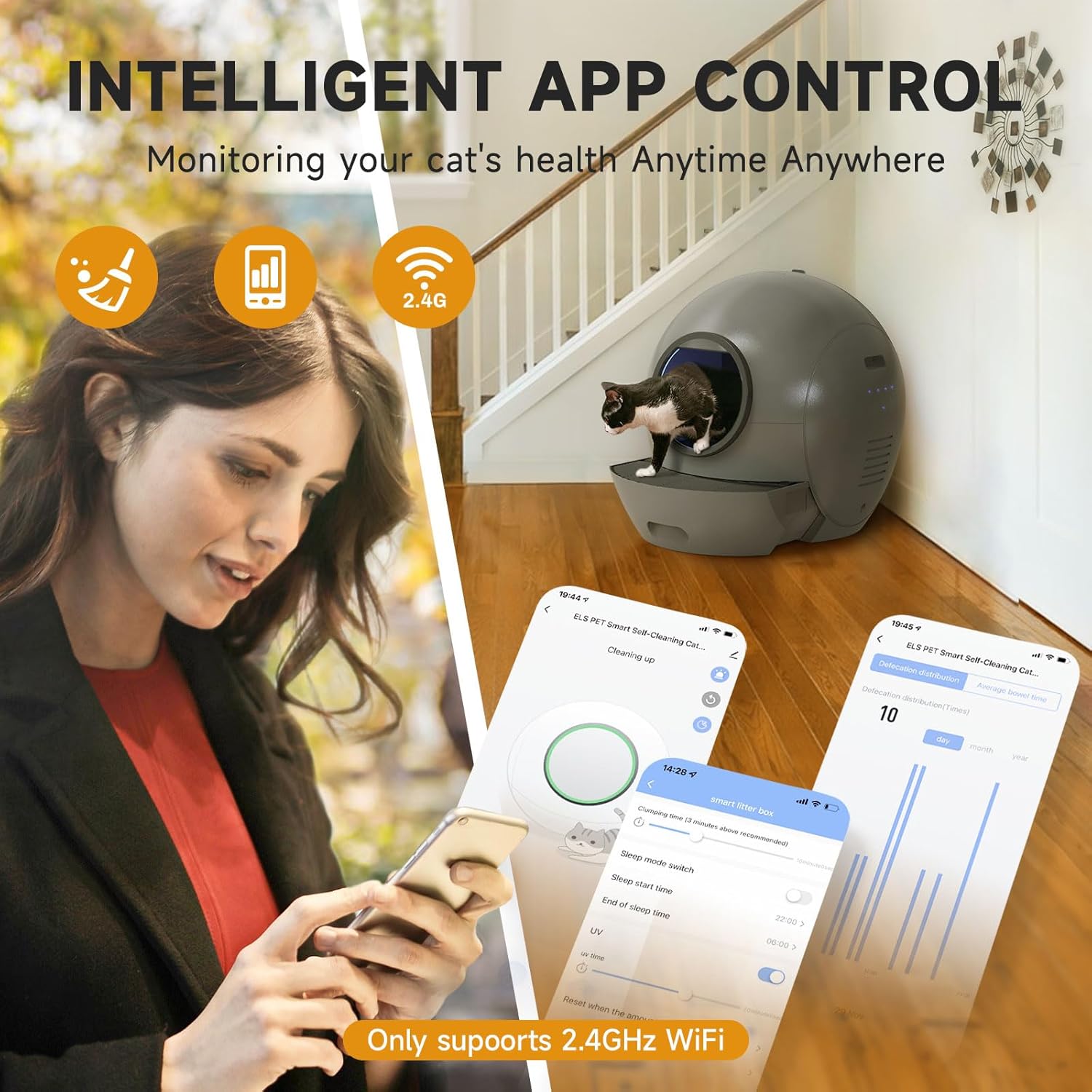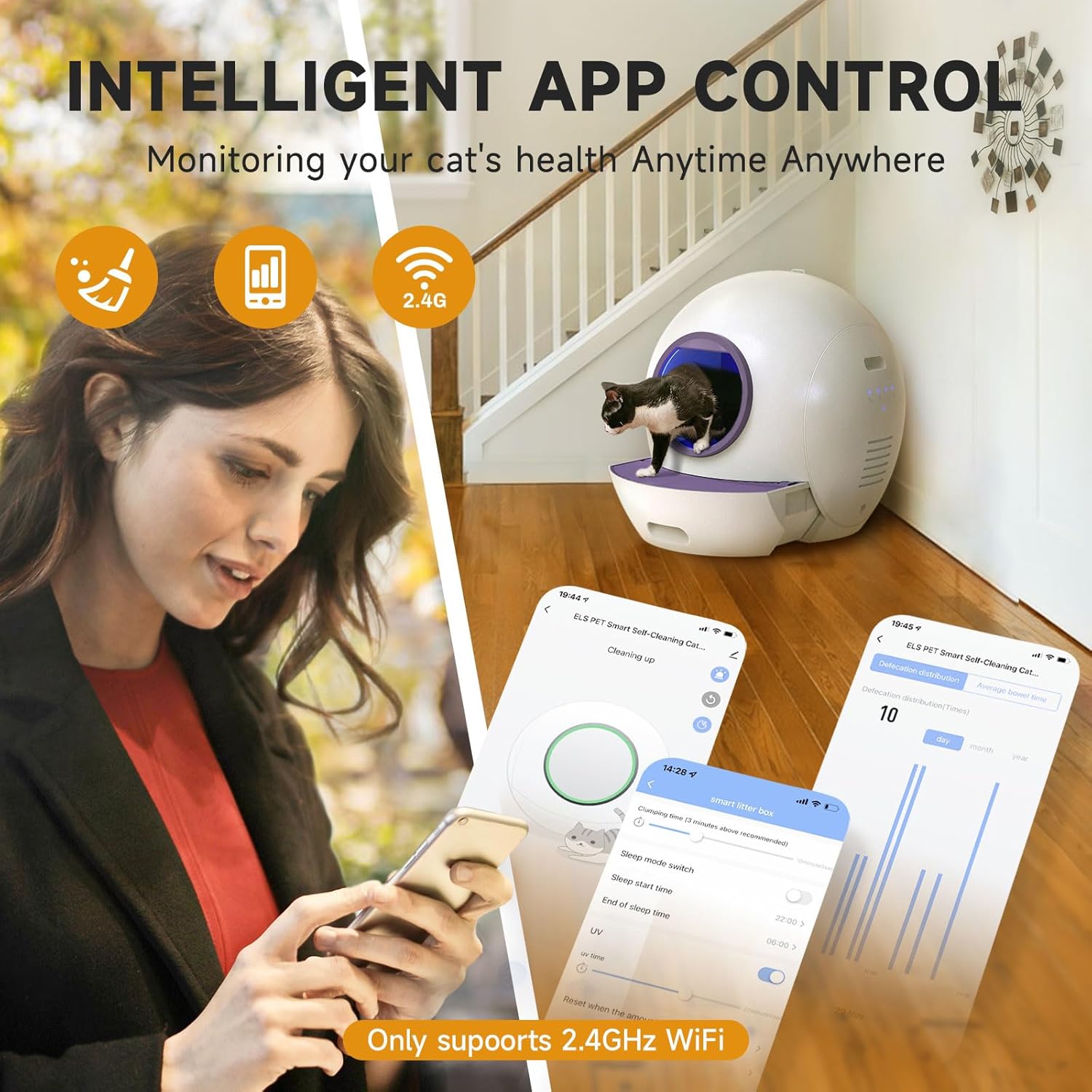 - 【Smart Health Monitoring】The self cleaning cat litter box connects to Wi-Fi (2.4 GHz only), allowing cat owners to monitor and control the automatic litter box via an app. The app displays the self cleaning status and lets you adjust the cleaning settings. This automatic self cleaning litter box offers added convenience and control, making the self cleaning experience easier and more customized for cat owners.