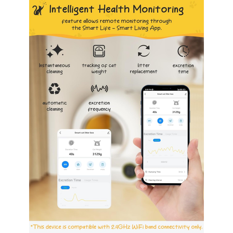 - Control Your Cat's Litter Box Remotely with the Smart App: Our innovative automatic cat litter box is equipped with a smart app that allows you to control it remotely. The four buttons represent four cleaning modes, including automatic sensing cleaning, timed cleaning, and one-button litter replacement. This feature is compatible with 2.4GHZ WiFi.