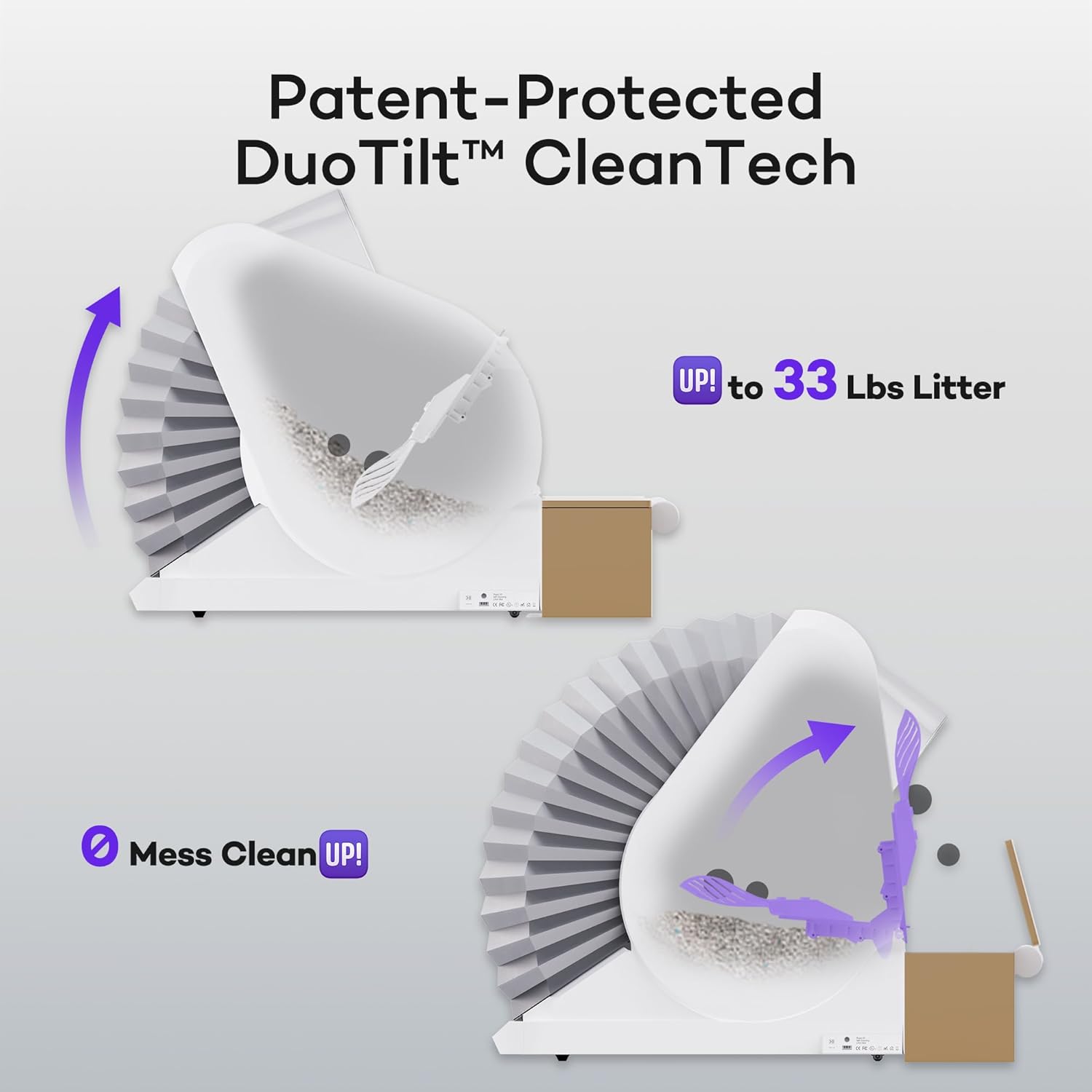 - 𝘾𝙡𝙚𝙖𝙣 𝗖𝗵𝗮𝗺𝗽𝗶𝗼𝗻: Two-stage tilting method combines passive & proactive operations (i.e. gravity sift and catapult dump) for thorough cleaning; leaves fewer scraps behind, dislodges sticky clumps, reduces dust created from abrasion, and minimizes stains trailed by runny poops