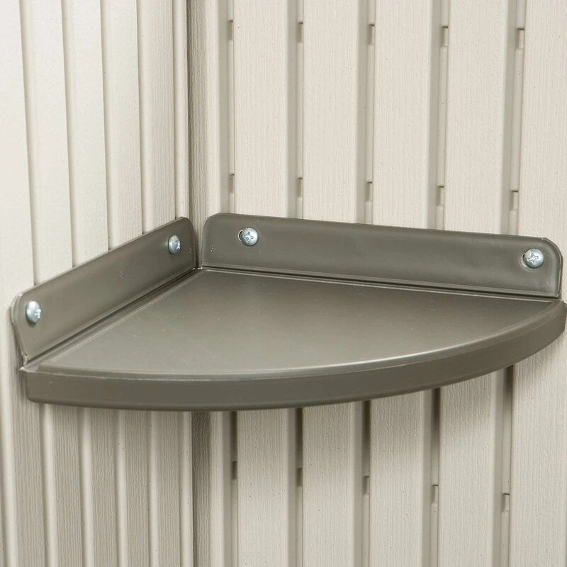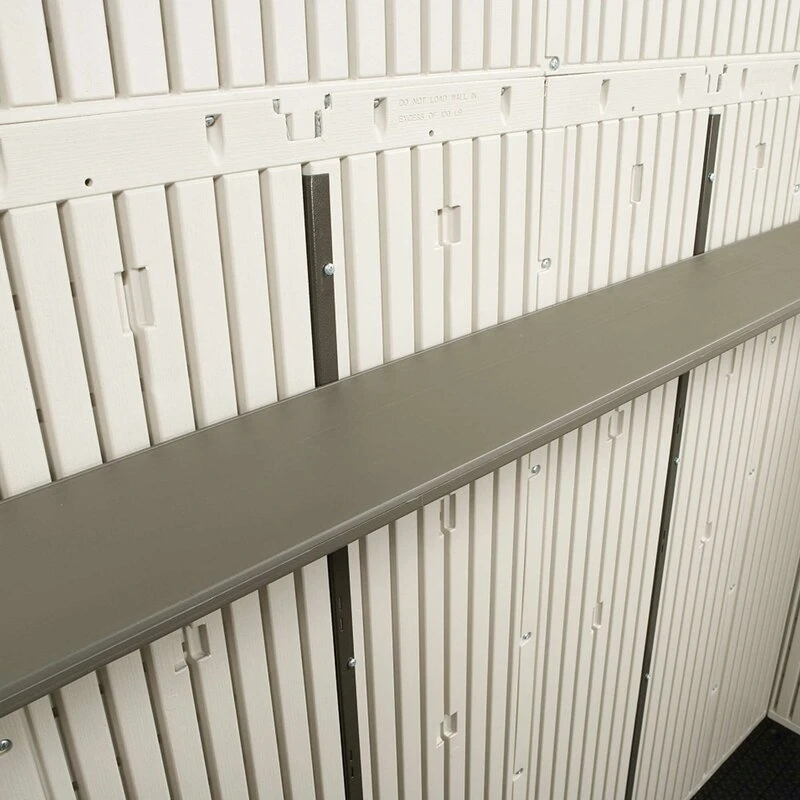 This 15' x 18' double door storage shed blends style and function to provide a superior outdoor storage solution. This eye-catching installation is constructed from high-density polyethylene (HDPE) plastic and is designed to withstand severe storms. Reinforced with powder-coated steel, this shed keeps your tools and garden equipment safe, dry, and conveniently located in your yard. It includes shelving units and tack strips for easy organization of tools. Low-maintenance, weather-resistant design resists fading and cracking. You must build this shed on a flat wood or concrete foundation.