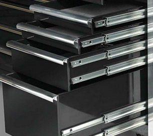 - Double channel spot welded support brackets on bottom underside of each drawer reinforces and prevents sagging.