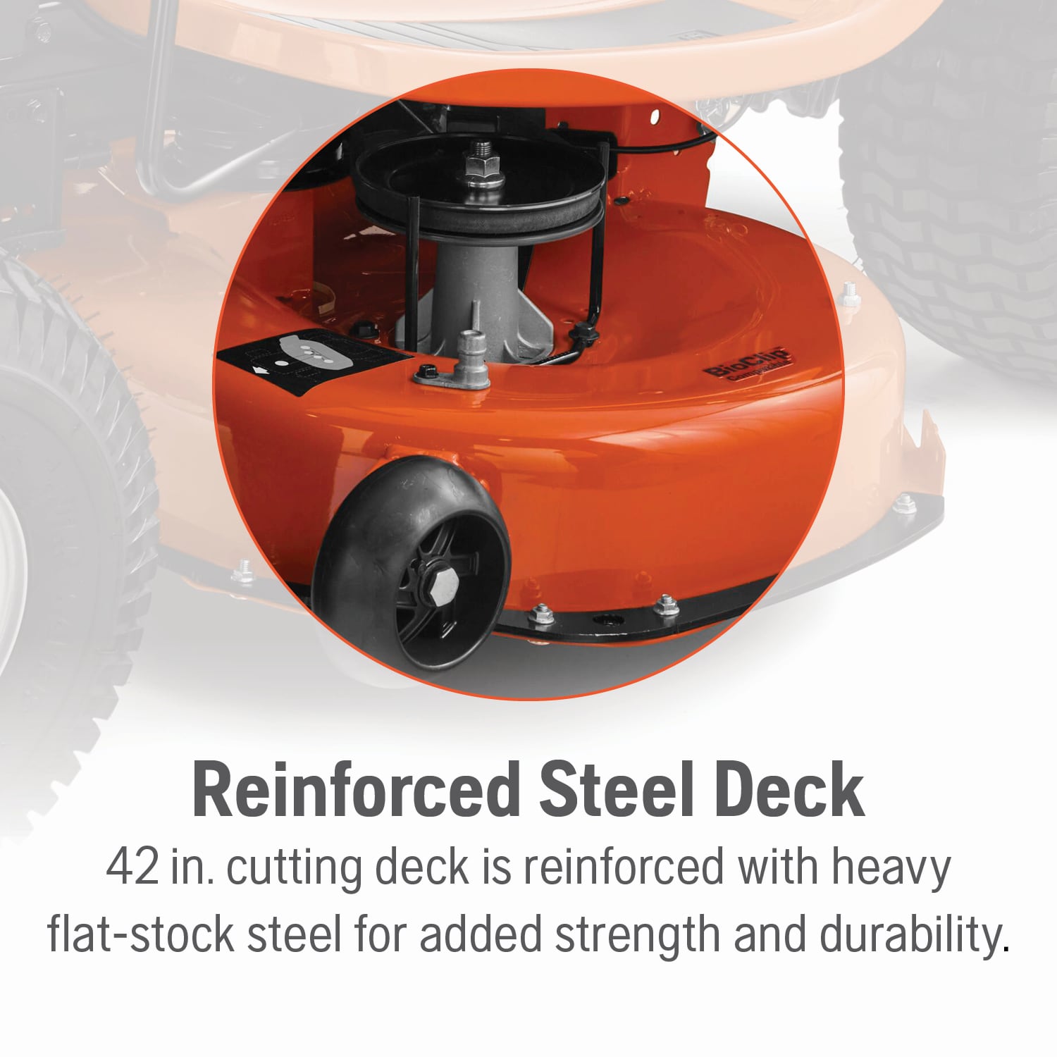 • Great for uneven terrain, this riding lawn tractor has two anti-scalp wheels to reduce risk of scalping and a cast iron front axle for extra stability